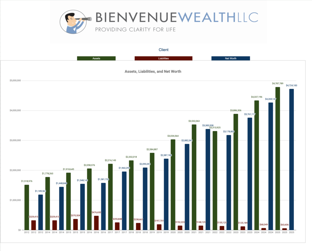 Net worth planning is behavioral. It’s about the decisions you make day in and day out. Growing your net worth is what financial planning is ultimately about. If your investments are up, but your net worth is flat or down, it’s worth asking: What could I have done differently this year? The most successful clients are the ones who follow a plan and focus on controllable inputs—savings, spending, debt, risk, and goals. Over time, this matters far more than any single year’s market return.